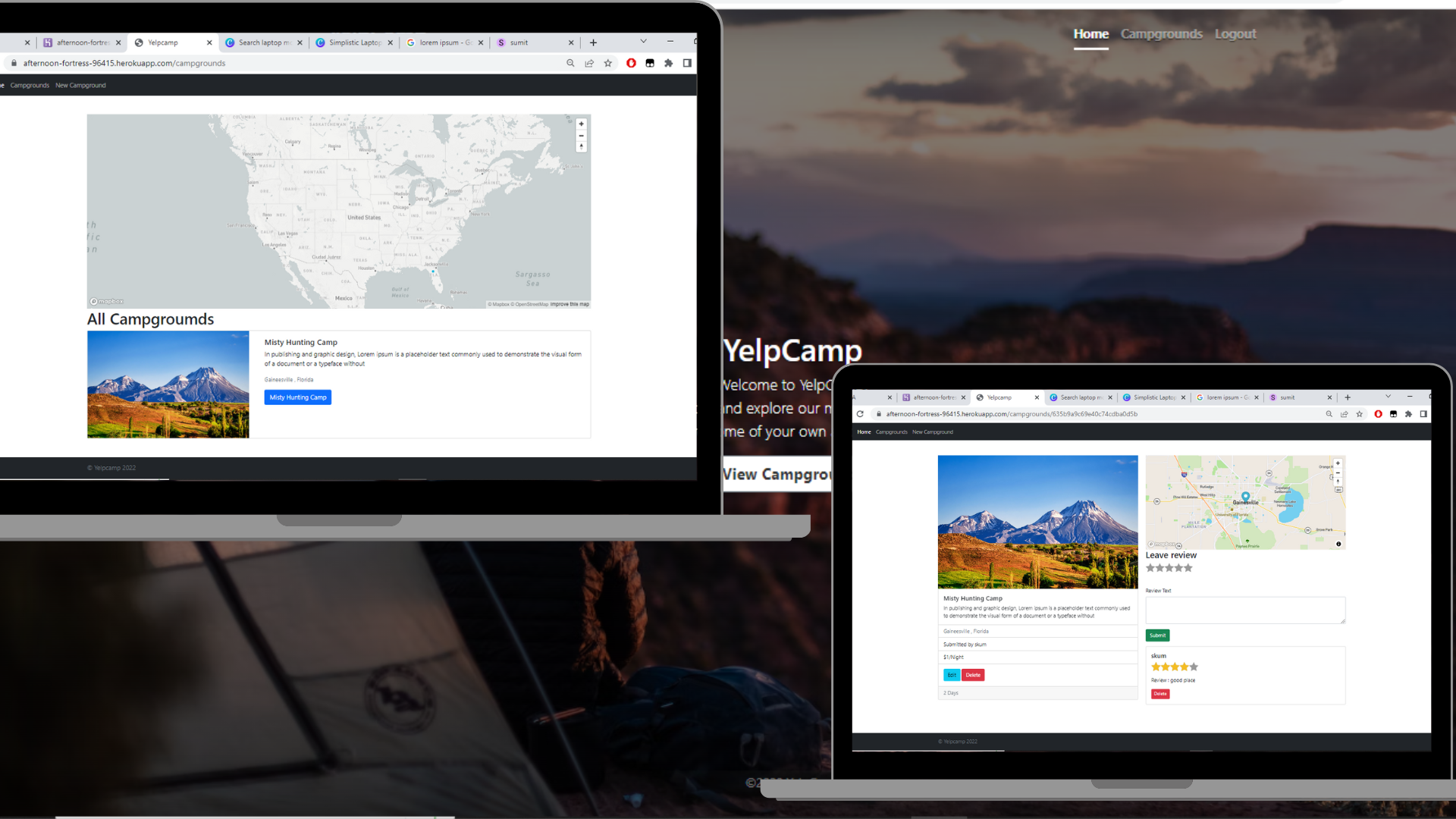 YelpCamp is a website where users can create and review campgrounds. In order to review or create a campground, you must have an account. This project was part of Colt Steele's web dev course on udemy.