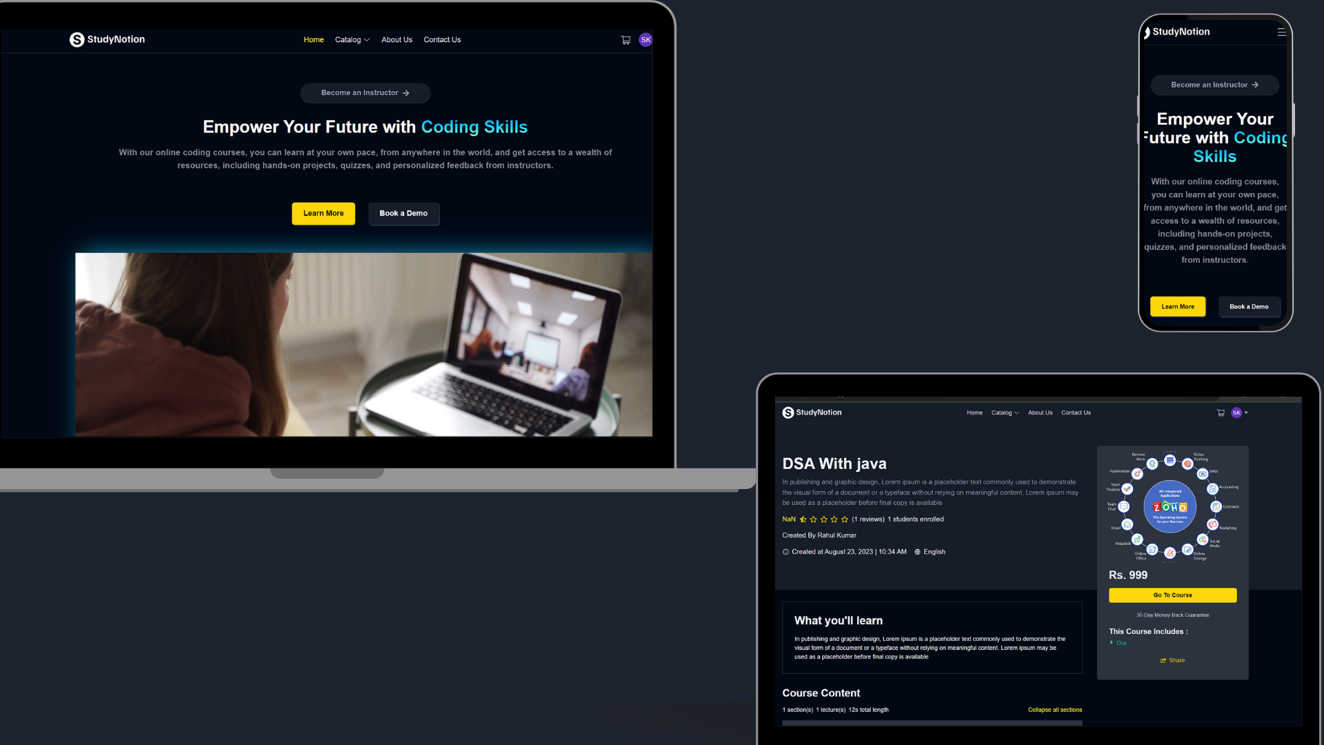StudyNotion is a fully functional ed-tech platform that enables users to create, consume, and rate educational content. The platform is built using the MERN stack, which includes ReactJS, NodeJS, MongoDB, and ExpressJS.
